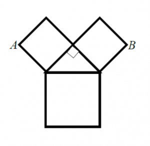 En la plaza de la iglesia de Tablate hemos encontrado una curiosa figura marcada en el suelo. Está formada por un triángulo rectángulo isósceles y tres cuadrados. Si la distancia entre A y B son 12 cm, ¿Cuál es el área, en cm2, de toda la figura?